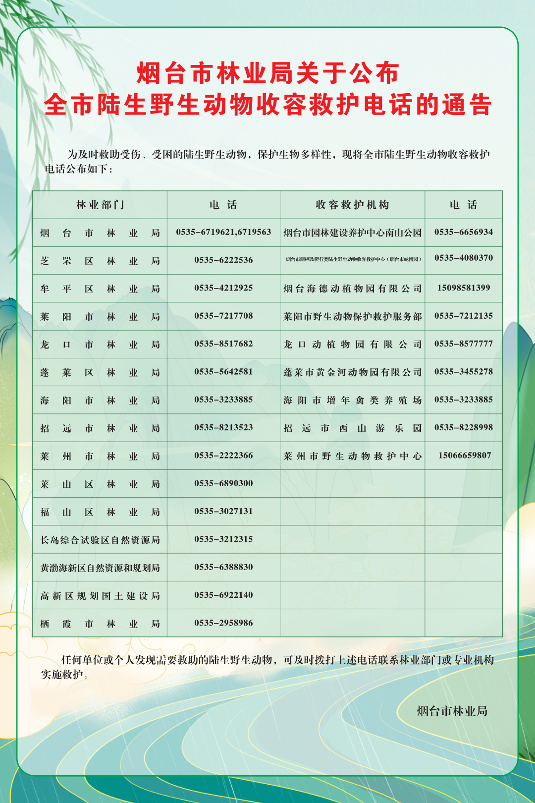 烟台市林业局关于公布全市陆生野生动物收容救护电话的通告